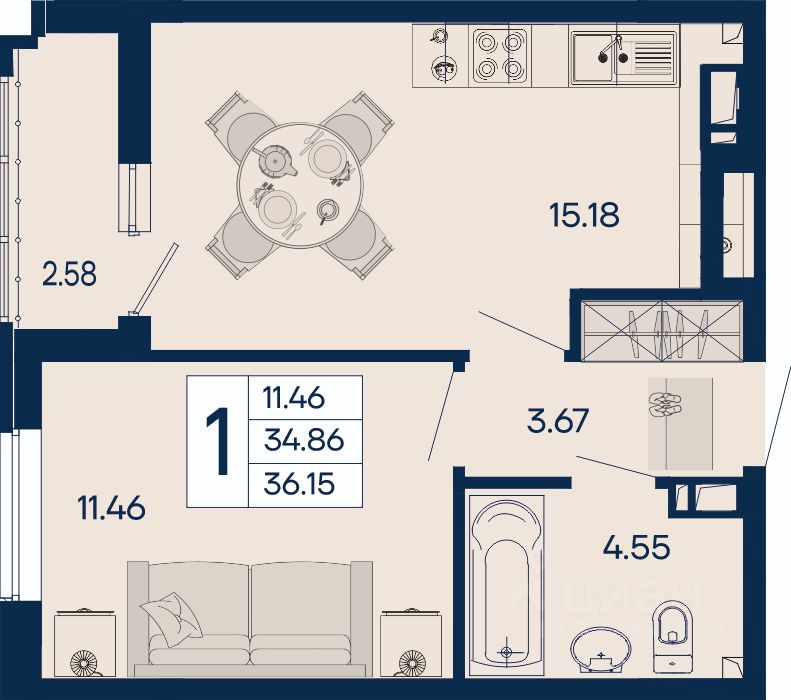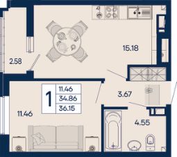 1 комнатная квартира 36.15 м² с ремонтом, на 7 этаже в жилом комплексе "Дом 101".