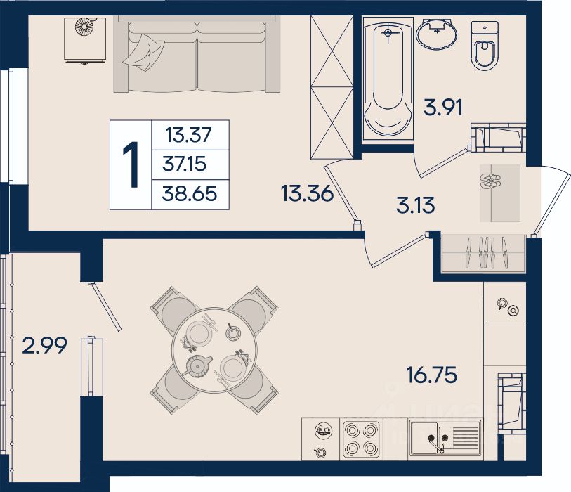 1 комнатная квартира 38.65 м² с ремонтом, на 13 этаже в жилом комплексе "Дом 101".