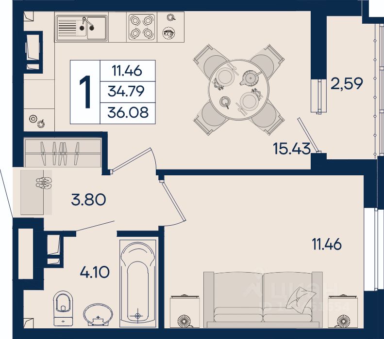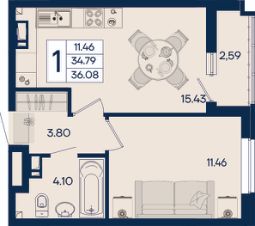 1 комнатная квартира 36.08 м² с ремонтом, на 4 этаже в жилом комплексе "Дом 101".