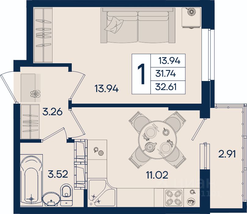1 комнатная квартира 32.61 м² с ремонтом, на 9 этаже в жилом комплексе "Дом 101".