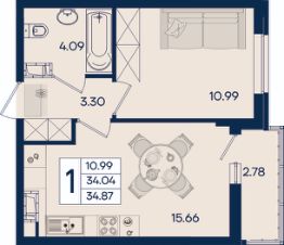 1 комнатная квартира 34.87 м² с ремонтом, на 16 этаже в жилом комплексе "Дом 101".