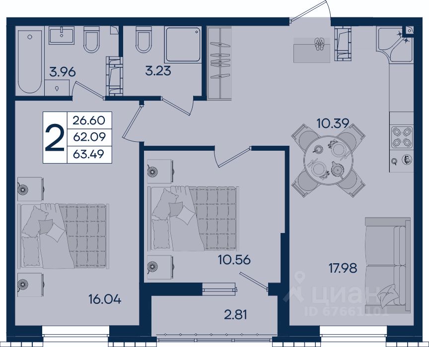2 комнатная квартира 63.49 м² с ремонтом, на 5 этаже в жилом комплексе "Дом 101".