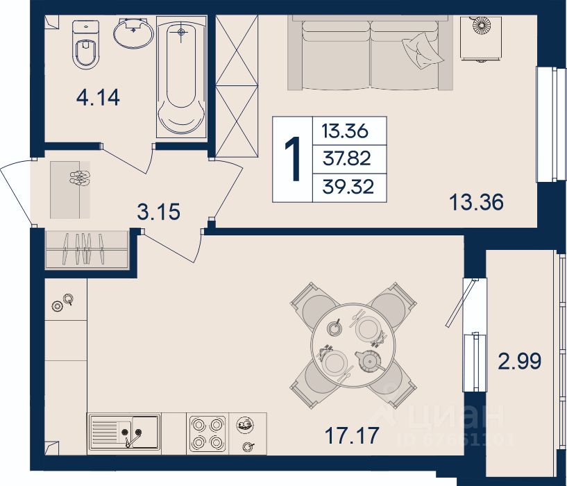 1 комнатная квартира 39.32 м² с ремонтом, на 2 этаже в жилом комплексе "Дом 101".