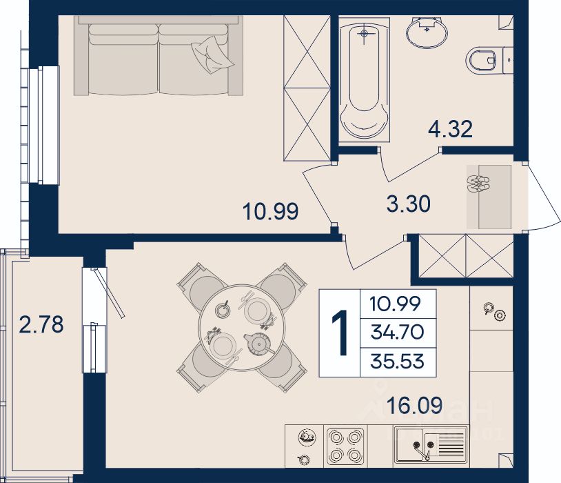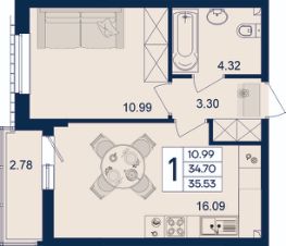 1 комнатная квартира 35.53 м² с ремонтом, на 2 этаже в жилом комплексе "Дом 101".