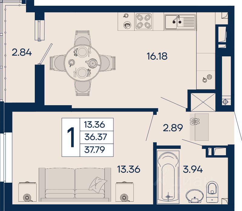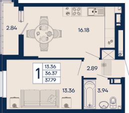 1 комнатная квартира 37.79 м² с ремонтом, на 4 этаже в жилом комплексе "Дом 101".
