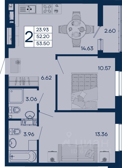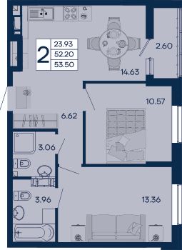 2 комнатная квартира 53.5 м² с ремонтом, на 4 этаже в жилом комплексе "Дом 101".