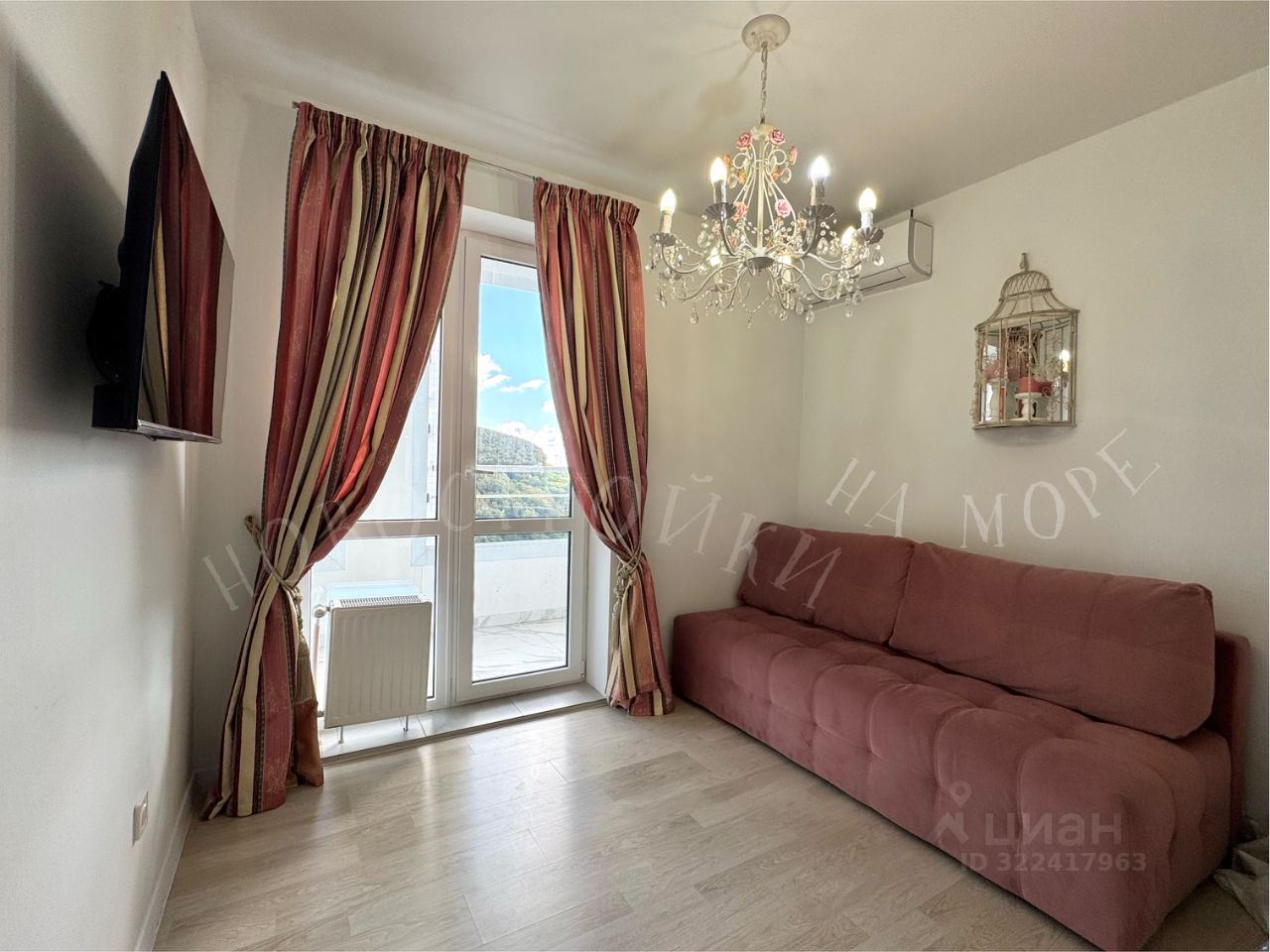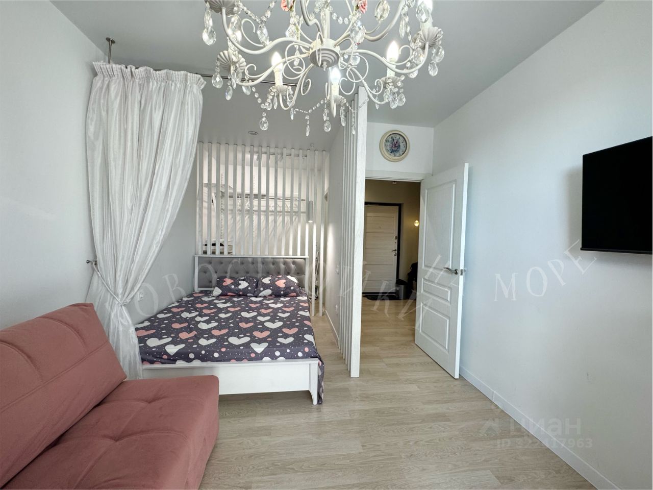 В спальне два спальных места: красивый диван цвета пудровой розы + двуспальная кровать. Есть кондиционер, телевизор.