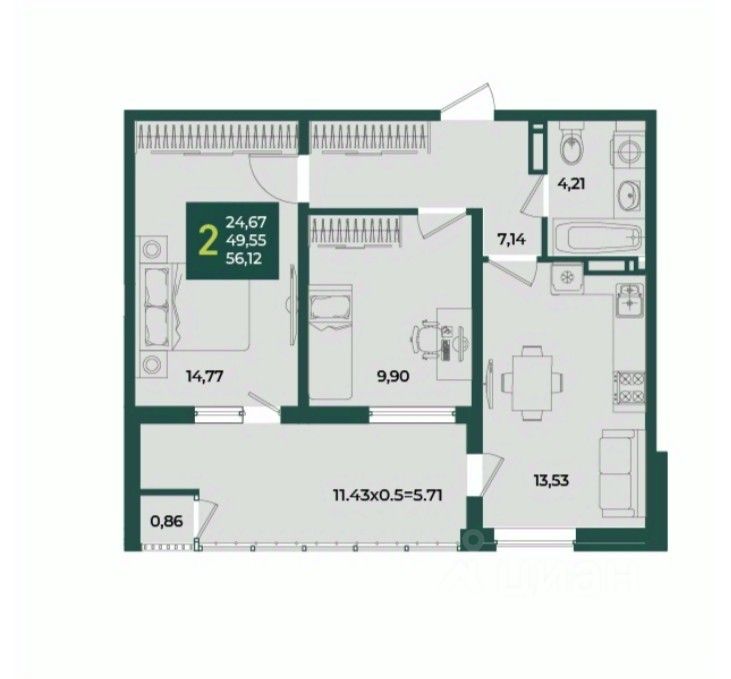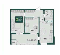 В продаже стильная 2 комнатная квартира с большой кухней 13.53м2