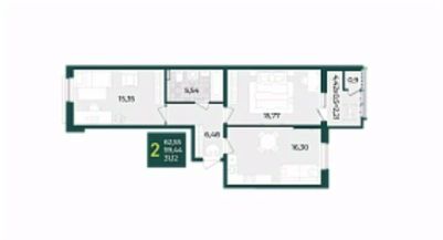 В продаже стильная 2 комнатная квартира с кухней- гостинной 16,30м2