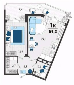 Комфортная планировка с просторной кухней-гостиной 25 кв.м., спальней - 14 кв.м., гардеробной комнатой и ленточной лоджией-террасой 8 кв.м.