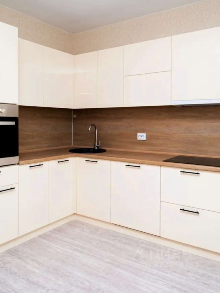 установлен кухонный гарнитур и техника встроенная варочная панель, духовой шкаф, вытяжка