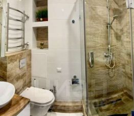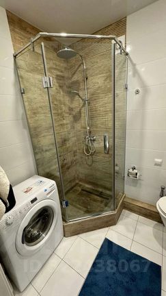 • В ванной комнате- душевая кабина, тумба с раковиной и зеркалом и стиральная машина