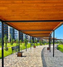 Во дворах : игровые площадки из эко-материалов, спортивное поле баскетбол, футбол, волейбол, станции для зарядки телефонов и WI-FI.
