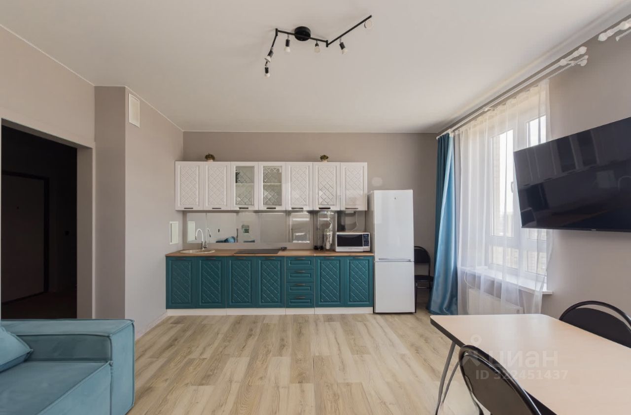 В квартире большая кухня-гостиная и 2 изолированные комнаты. В комнатах огромные лоджии с панорамными окнами, из которых можно сделать кабинет или комнату. Окна выходят на парк, школу и детские сады. Рядом уже не будет высокоэтажных зданий и вид ничто не перекроет.