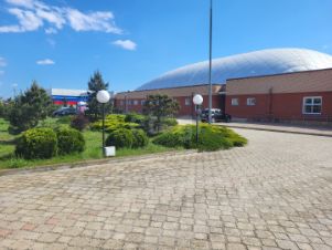 Во дворе есть много цветников, парковка для машин, детская игровая зона.