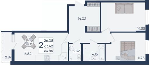 2 комнатная квартира с ремонтом 64.86 м², на 2 этаже в жилом комплексе "Дом 101".