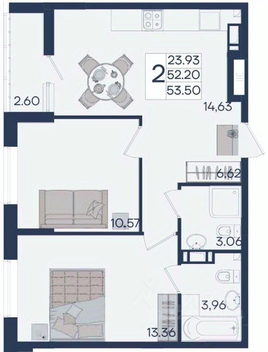2 комнатная квартира с ремонтом 53.5 м², на 3 этаже в жилом комплексе "Дом 101".