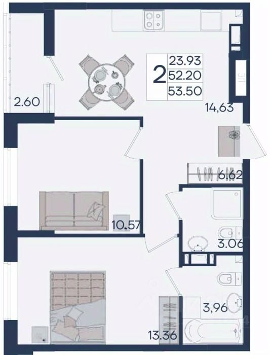2 комнатная квартира с ремонтом 53.5 м², на 7 этаже в жилом комплексе "Дом 101".