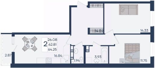 2 комнатная квартира с ремонтом 64.25 м², на 9 этаже в жилом комплексе "Дом 101".