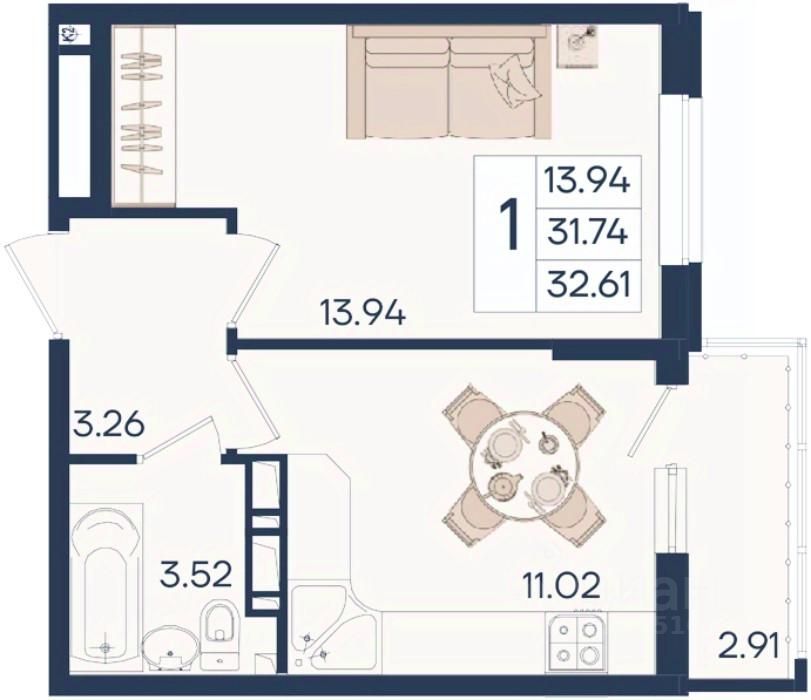 1 комнатная квартира с ремонтом 32.61 м², на 11 этаже в жилом комплексе "Дом 101".