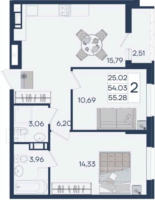 2 комнатная квартира с ремонтом 55.28 м², на 3 этаже в жилом комплексе "Дом 101".