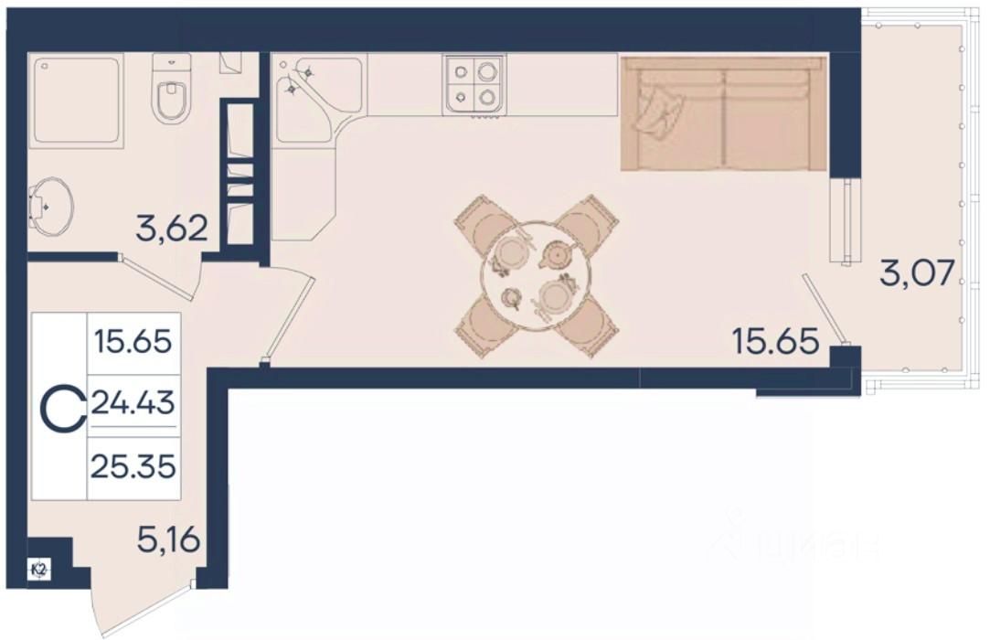 Студия 25.35 м², на 4 этаже в жилом комплексе "Дом 101".