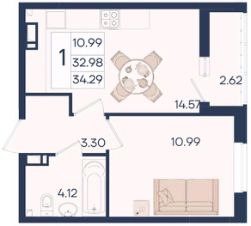 1 комнатная квартира с ремонтом 34.29 м², на 3 этаже в жилом комплексе "Дом 101".