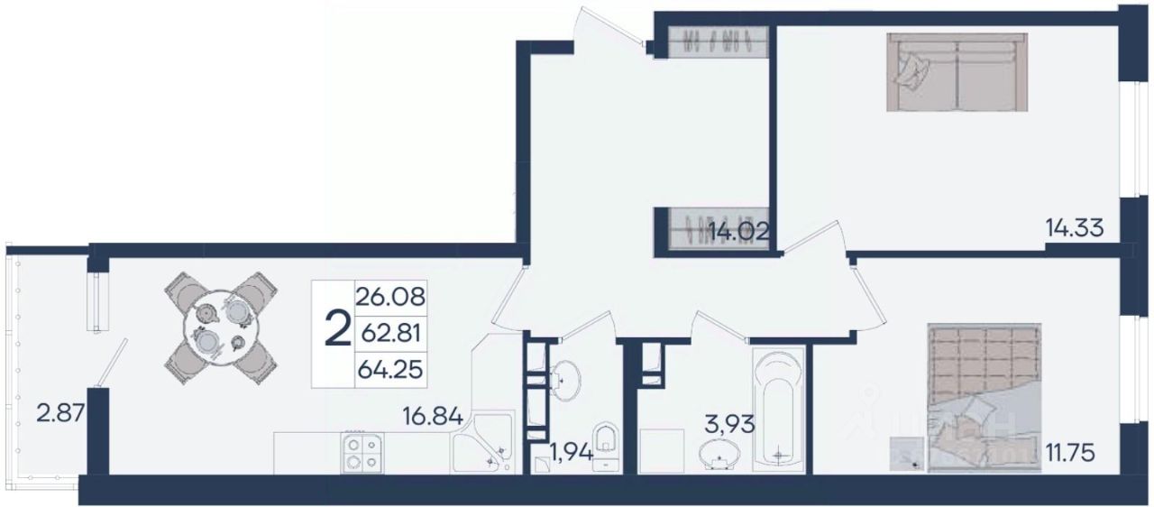 2 комнатная квартира с ремонтом 64.25 м², на 6 этаже в жилом комплексе "Дом 101".