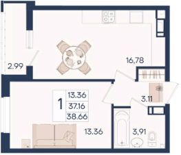 1 комнатная квартира с ремонтом 38.66 м², на 4 этаже в жилом комплексе "Дом 101".