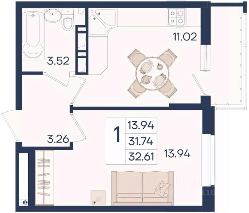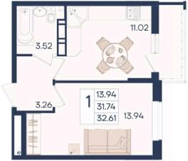 1 комнатная квартира с ремонтом 32.61 м², на 11 этаже в жилом комплексе "Дом 101".