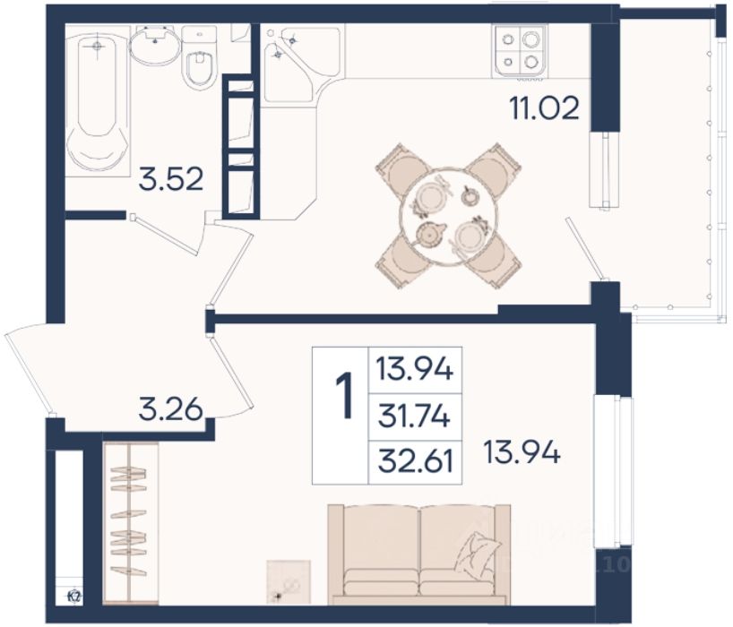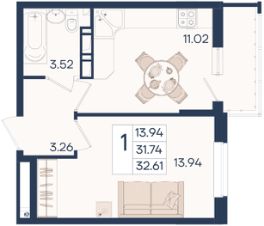 1 комнатная квартира с ремонтом 32.61 м², на 14 этаже в жилом комплексе "Дом 101".