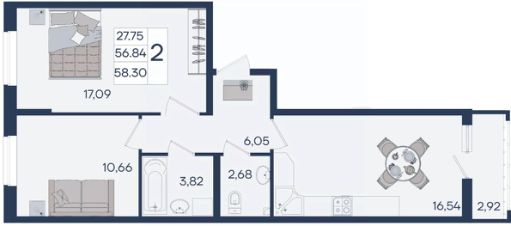 2 комнатная квартира с ремонтом 58.3 м², на 2 этаже в жилом комплексе "Дом 101".