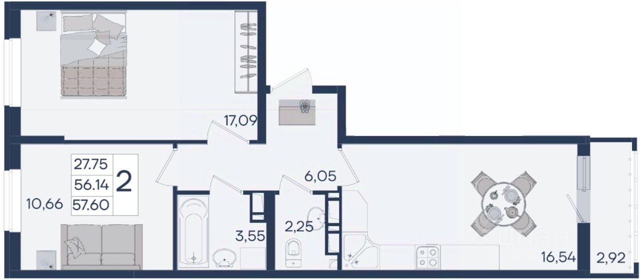 2 комнатная квартира с ремонтом 57.6 м², на 5 этаже в жилом комплексе "Дом 101".