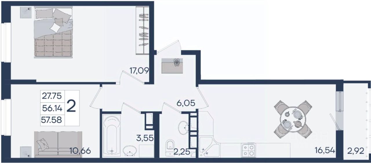 2 комнатная квартира с ремонтом 57.58 м², на 17 этаже в жилом комплексе "Дом 101".