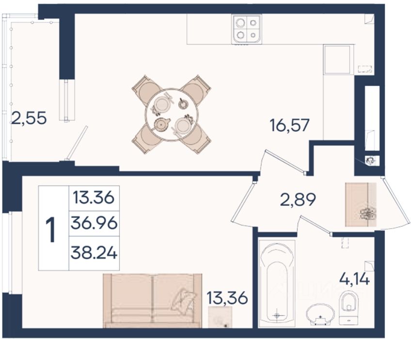 1 комнатная квартира с ремонтом 38.24 м², на 2 этаже в жилом комплексе "Дом 101".