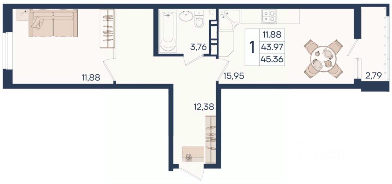 1 комнатная квартира с ремонтом 45.36 м², на 5 этаже в жилом комплексе "Дом 101".