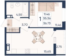 1 комнатная квартира с ремонтом 36.73 м², на 5 этаже в жилом комплексе "Дом 101".