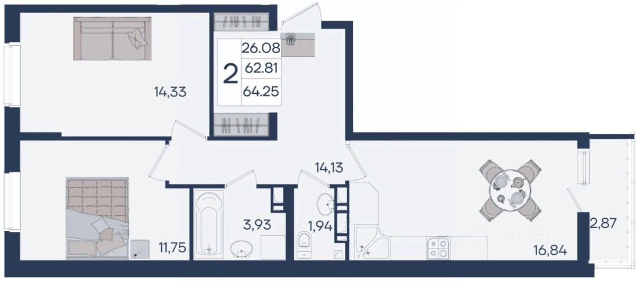 2 комнатная квартира с ремонтом 64.25 м², на 5 этаже в жилом комплексе "Дом 101".