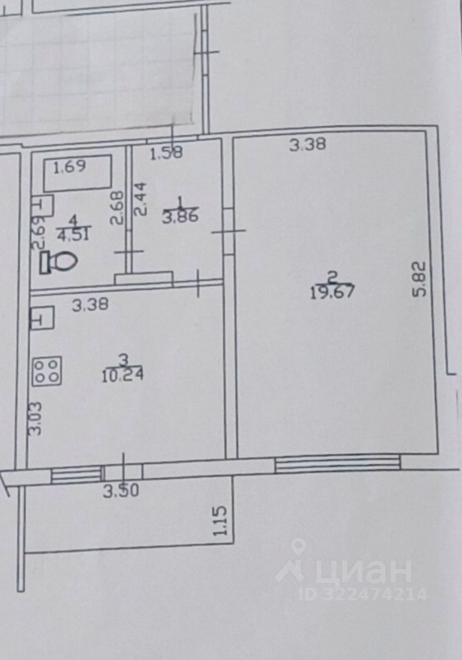 Площадь квартиры по выписке 39,5 м2, плюс балкон 3,5 м из кухни, не застеклён. Комната 20 м, кухня 10,3 м, санузел совмещенн. 4,5 м, коридор 4 м.