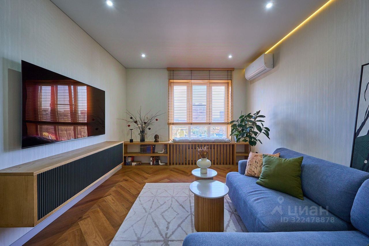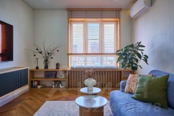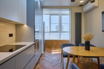 В гостиной установлены деревянные жалюзи, а на всех окнах и балконе — деревянные откосы. Пол покрыт SPC кварцвинилом, который придает квартире стильный и современный вид. На окнах висят премиальные рулонные шторы.