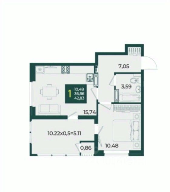 Просторная лоджия 10.22 м2 станет отличным местом для отдыха, создания зимнего сада или уютного уголка для работы. Она прекрасно освещена и остеклена