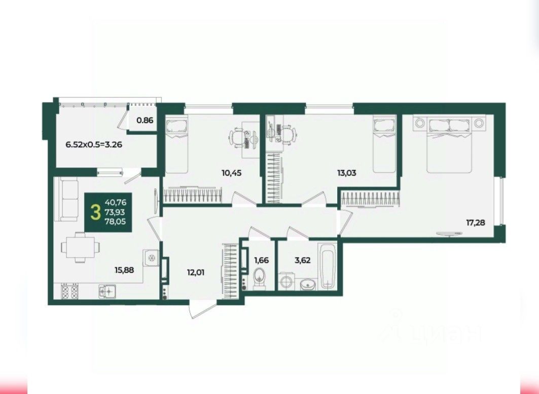 Лоджия 6,52м2 станет отличным местом для отдыха, создания зимнего сада или уютного уголка для работы. Она прекрасно освещена и остеклена
