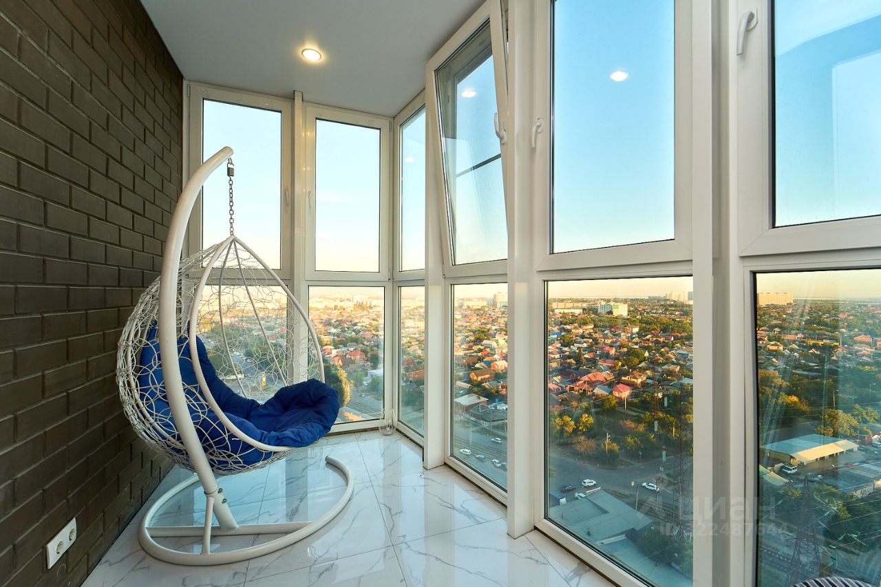Панорамное остекление балкона с восточной стороны. Прекрасный вид, обеспечивающий уединение и много естественного света. В квартире светло и не жарко.