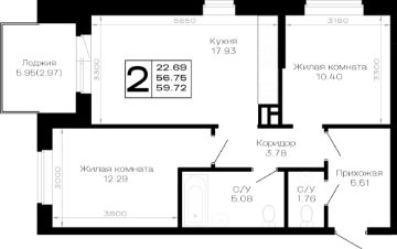 Продаётся 2-комнатная квартира в строящемся доме (квартал 7.1 литер 1), срок сдачи: IV-кв. 2026, общей площадью 59.72 кв.м., на 1 этаже. Новый жилой комплекс по ул. Николая Лебедева от застройщика "ССК"