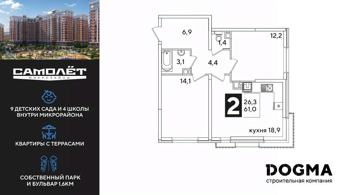 DOGMA - ТОП-3 застройщик по объему строительства в РФ. "САМОЛЁТ" — концептуальный жилой микрорайон, который расположен на северо-западе Краснодара, в районе Западного Обхода. Квартал спроектирован как "город в городе", поэтому здесь будет всё для комфортной жизни: современные дома с разными планировками, дороги, школы и детские сады, поликлиника, торговые центры, парки и аллеи. Микрорайон находится далеко от промышленных предприятий, сочетает удобство городской жизни и экологически благоприятную среду. Инфраструктура нового микрорайона: • 4 школы и 9 детских садов на территории микрорайона • Функциональные планировки • Собственный бульвар протяжённостью 1,6км • Светомузыкальный фонтан протяжённостью 55 метров • Амфитеатр • Парк 7 ГА • Скейт-парк • Детская аква-площадка • Круглосуточное видеонаблюдение и пост охраны Приобрести квартиру можно одним из способов: ипотека, рассрочка, наличный расчет.