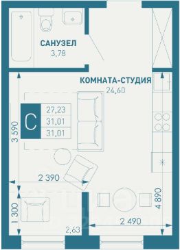 Эта отличная от других квартира-студия , расположена на 8-м, эргономично спланирована, имеет просторную террассу с панорамнным остеклением. Общая площадь жилья составляет 30 м2, кухня-гостиная 24м2, с нишей под спальню, санузел 3,7 м2, и лоджию-террасу 2,6 м2. Эта планировка весьма вариативна и эргономична, и создает совершенно гармоничное пространство с обособленными функциональными зонами.