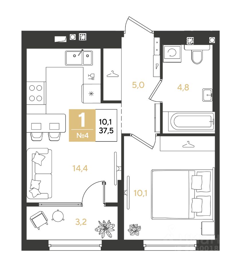1-комн. квартира, 37,5 м²