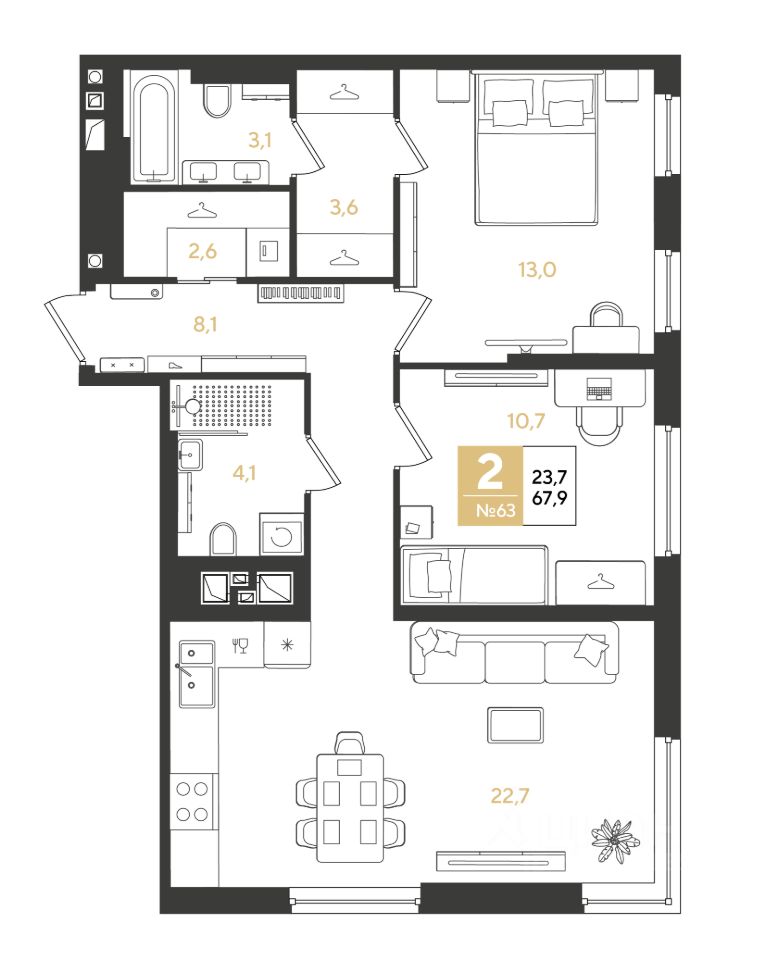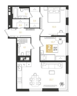Продаётся 2-комнатная квартира в строящемся доме (Литер 2), срок сдачи: II-кв. 2028, общей площадью 67.9 кв.м., на 8 этаже. Новый жилой комплекс "Самолёт-7" от застройщика "DOGMA" расположен по адресу Краснодарский край, Город Краснодар.