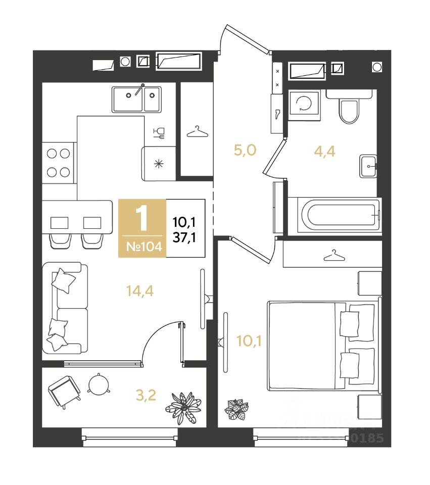 1-комн. квартира, 37,1 м²