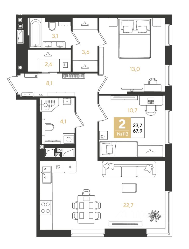 Продаётся 2-комнатная квартира в строящемся доме (Литер 2), срок сдачи: II-кв. 2028, общей площадью 67.9 кв.м., на 13 этаже. Новый жилой комплекс "Самолёт-7" от застройщика "DOGMA" расположен по адресу Краснодарский край, Город Краснодар.